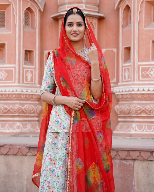 'Kesar' - Mustard Orange Floral Print Rajputi Suit Set + Deep Red Bandhani Odhani 'Kesar' - Mustard Orange Floral Print Rajputi Suit Set + Deep Red Bandhani Odhani