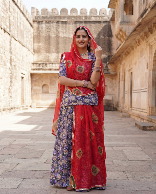 The fabric is soft, breathable, and easy to stitch, made specifically for Rajputi poshak and traditional attire. It drapes cleanly, doesn’t feel stiff, and holds its look even after wear. This is the kind of combination Rajputi outfits are known for: subtle base, strong odhani.